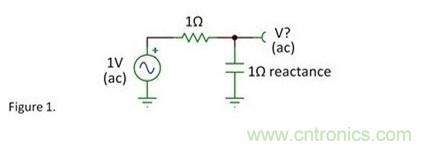 一個(gè)1V的交流信號(hào),連接著一個(gè)1Ω電阻和一個(gè)1Ω電抗的電容。在電容兩端的交流電壓是多少?