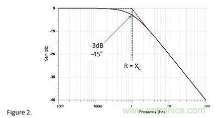 R/C電路產(chǎn)生了極點(diǎn)。阻值和抗值相等時(shí)的頻率為“拐點(diǎn)”或稱(chēng)截至頻率。這點(diǎn)的響應(yīng)是-3dB(0.707V)的衰減,和45°的相位滯后。如圖所示:不需要數(shù)學(xué)計(jì)算,波特圖如下: