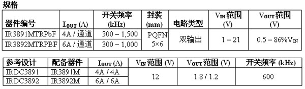 全新雙輸出器件對5V到12V輸入、1V到21V輸入 (使用5V外偏置) 單電源軌操作進行了優(yōu)化。IR3891和IR3892采用了纖巧的5×6mm PQFN封裝,在165mm2的小巧占位面積內(nèi),分別為需要4A/通道或者6A/通道的應(yīng)用帶來極為緊湊的解決方案。