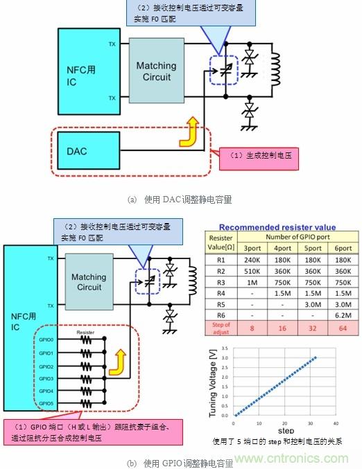 第二, 如圖2(b)所示,從NFC用IC等GPIO端口生成控制電壓來調(diào)整靜電容量。GPIO是General Purpose Input/Output的簡稱,是IC芯片提供的輸出端子的一種。特定用途和信號尚未明確,但可以根據(jù)軟件指令進(jìn)行任意的輸出變化。比如說,軟件指示為輸入“0”的話則為0V,指示為輸入“1”的話則有可能會執(zhí)行輸出3V的操作。如果利用GPIO的輸出端子的話,如果收到的是0V、3V這兩個值的輸出信號,那么執(zhí)行的操作就是通過2n的電子元件的組合來實(shí)現(xiàn)合成2n的阻抗電壓。