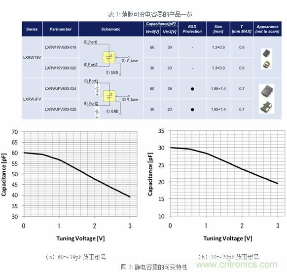 靜電容量可變特性如圖3所示,當(dāng)施加控制電壓為0~3V時,配備了60~39pF范圍、30~20pF范圍的2個類型。