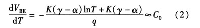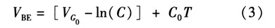 如果忽略由溫度變化引起lnT項變化對式(2)的影響,dVBE/dT可近似等于常數(shù)C0。常溫下C0約為-2 mV/K。為了簡化計算,則PN結(jié)關(guān)于溫度的變化方程可近似線性為![]()
