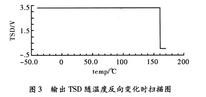 按照以上設(shè)計的電路。用Cadence Specture對其進行仿真,器件的模型參數(shù)采用0.35μm CMOS工藝。圖2為過溫保護電路的輸出控制信號TSD,隨溫度上升和下降的曲線。電源電壓取3.3 V。從仿真結(jié)果可以看出,該電路實現(xiàn)了良好的“溫度遲滯”特性。遲滯功能有效的避免了芯片出現(xiàn)熱振蕩問題。關(guān)斷溫度TH160°和恢復(fù)溫度TL140°。