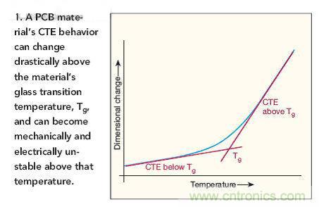 圖1:PCB材料的熱膨脹系數(shù)(CTE)特性在高于材料的玻璃化溫度Tg時會發(fā)生急劇變化,并且在機(jī)械和電氣方面變得不穩(wěn)定