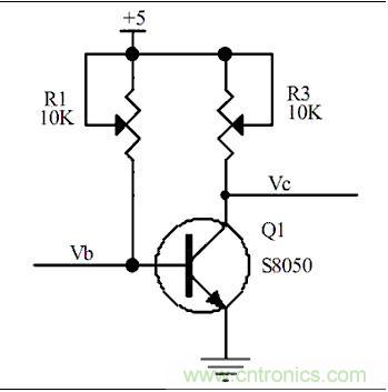 2、當(dāng)我們調(diào)節(jié)可調(diào)電阻,R1,使R1=4.3K時(shí),通過歐姆定律我們可以計(jì)算得到,Ib=(5-0.7)/4.3K=1mA,那我們就可以計(jì)算出IC=Hfe*Ib=10mA,假如這個(gè)時(shí)候我調(diào)節(jié)R3,使R3=1K歐姆,通過計(jì)算我們可以得到Vc=5-(10mA*1K)=-5V,回出現(xiàn)-5V嗎,當(dāng)然不會(huì),因?yàn)闆]有負(fù)壓,所以Vc的電壓會(huì)停留在0V,那這個(gè)時(shí)候我們再來看下Ic到底是多少?
