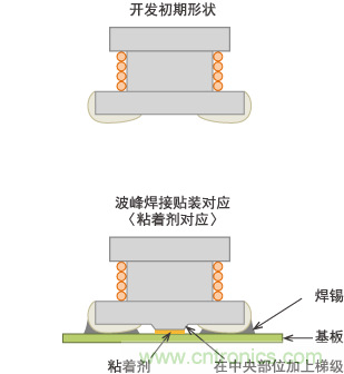 在 生產(chǎn)第一代LQN5N及第二代LQH32M時(shí),雖會(huì)對部分混合IC基板進(jìn)行回流焊接,但一般是對裝有插腳零部件的基板背面進(jìn)行波峰焊接。其貼裝方法是將膠 粘劑涂在基板焊盤的中央部或貼片元件電極的中央部,待其固化后將其投入波峰焊接槽。與CR貼片元件相比,體積較大的LQH系列在受到焊錫流動(dòng)阻力后易發(fā)生 脫落,因此在電極間中央部位設(shè)計(jì)了突起(稱為梯級磁芯)?,F(xiàn)在看來的話,是反向支架形狀。至今再也見不到這種結(jié)構(gòu)。