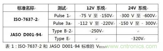 最大重復反向電壓是二極管在反向偏壓模式中能夠承受的最大電壓。在反向偏壓模式中,流過二極管的漏電流會在二極管結中產(chǎn)生熱量并導致熱失控。模擬該條件的測試包括美國的ISO-7637-2 pulse 1和3a以及日本的JASO D001-94標準type B和E.Each,這些測試的峰電壓如下表所示。