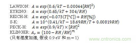 檢索現(xiàn)有文獻(xiàn),Peck是提到的另一個(gè)作者。他改變了Lawson建議值,發(fā)現(xiàn)使用相對(duì)濕度能夠適應(yīng)他自己的測(cè)試結(jié)果。在一篇文章里,Hallberg很好地概括了所有濕度測(cè)試和加速模型,包括他自己的。過(guò)去30年,他與Peck對(duì)濕度加速進(jìn)行了大量研究。在很多出版物里都提到,他們的研究成果的適應(yīng)性最好。圖8是Hallberg收集的可用模型。除了溫度意外,他們都使用相對(duì)濕度做為主要的測(cè)量參數(shù)。檢索最近幾年有關(guān)濕度加速的出版物,我們發(fā)現(xiàn),人們還在使用與Hallberg和Peck 描述或收集的模型相同的或可比較的模型。