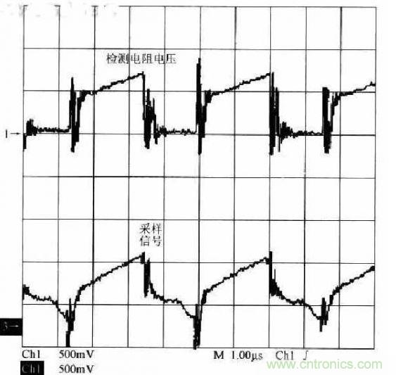 圖4給出了UC3842檢測(cè)電阻的電壓波形和采樣信號(hào)波形。從圖4中可以看出,經(jīng)過改進(jìn)后的電路,其采樣信號(hào)的波形緊緊跟隨檢測(cè)電阻的電壓波形,沒有出現(xiàn)非常大的尖峰電壓。因此,該電路能有效避免因變壓器漏感等異常干擾引起的電源誤操作的問題,也能有效避免因電源占空比過大而引起的系統(tǒng)不穩(wěn)定的問題。