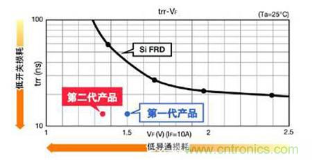 圖1.SiC肖特基二極管與硅材質(zhì)FRD特性比較(650V/10A級)