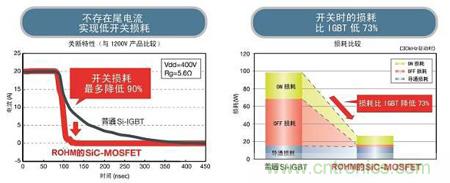 圖2. 普通Si-IGBT和ROHM的SiC-MOSFET的開關(guān)損耗比較