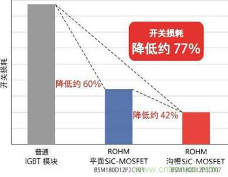 ROHM首先實現(xiàn)了采用量產(chǎn)中的溝槽結(jié)構(gòu)SiC-MOSFET元件的“全SiC”功率模塊的產(chǎn)品化。該產(chǎn)品的額定電壓為1200V,額定電流為180A,內(nèi)部電路為半橋配置。與同等額定水平的Si-IGBT功率模塊產(chǎn)品相比,其顯著優(yōu)勢當然不必言說,即使與量產(chǎn)中的1200V/180A的SiC-MOSFET模塊相比,其開關(guān)損耗也大幅降低(圖7)。