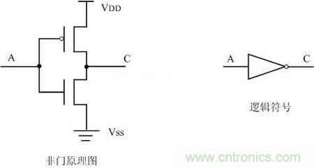 A端為高電平時,P型管截止,N型管導(dǎo)通,輸出端C的電平與Vss保持一致,輸出低電平;A端為低電平時,P型管導(dǎo)通,N型管截止,輸出端C的電平與VDD一致,輸出高電平。