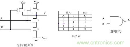 將上述“與非”門、“或非”門邏輯符號的輸出端的小圓圈去掉,就成了“與”門、“或”門的邏輯符號。而實現(xiàn)“與”、“或”功能的電路圖則必須在輸出端加上一個反向器,即加上一對CMOS管,因此,“與”門實際上比“與非”門復(fù)雜,延遲時間也長些,這一點在電路設(shè)計中要注意。