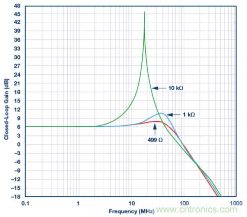 圖1. 使用不同反饋電阻的實驗室結(jié)果。VS = ±5 V,VOUT = 40 mV p-p,RLOAD = 1 k?,RF值為499 ?、1 k?和10 k?。