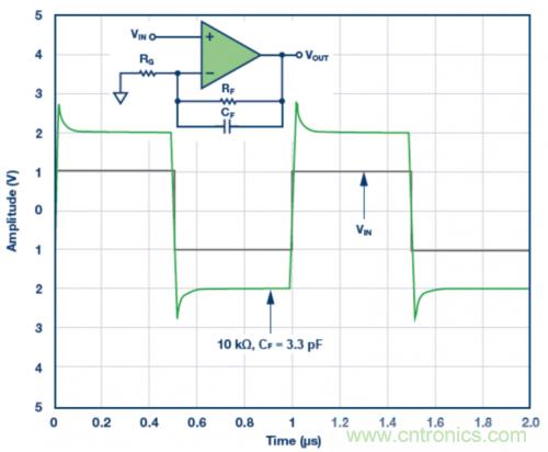 圖4. 3.3 pF反饋電容CF的脈沖響應(yīng)模擬結(jié)果。VS = ±5 V,G = 2,RF = 10 k?且RLOAD = 1 k?