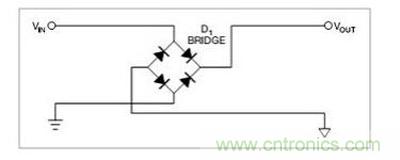 圖2是一個橋式整流器,不論什么極性都可以正常工作,但是有兩個二極管導(dǎo)通,功耗是圖1的兩倍。