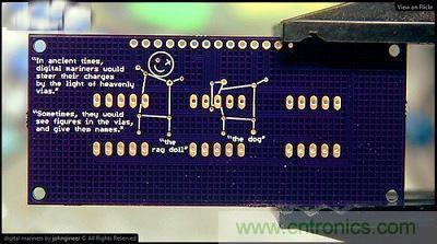 下面是一位自稱“johngineer”的網(wǎng)友作品,這家伙的網(wǎng)站有不少很酷的東西(例如一只他自 己做的超酷龐克風(fēng)手表),還有非常專業(yè)的技術(shù)文章。“johngineer”沒有解釋這個(gè)電路板的作用,但他在上面印了兩段文字,想象未來如果有考古學(xué)家挖到這片電路板,會(huì)怎么解讀這種“文物”?