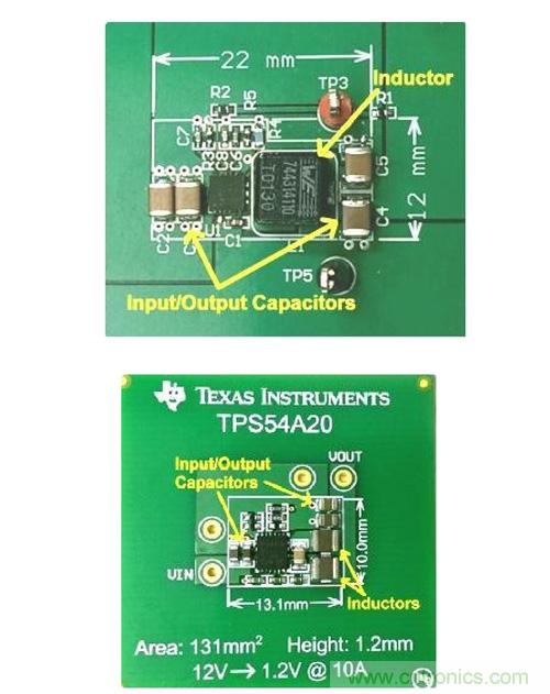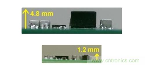 穩(wěn)壓器尺寸的減小為我們提供了更多的機(jī)會。對比圖2中所示的高度剖面圖我們可以看到,常規(guī)降壓變換器的高度為4.8毫米,然而對于背面部件而言,這一高度遠(yuǎn)超很多系統(tǒng)的高度限制。串聯(lián)電容降壓轉(zhuǎn)換器(1.2毫米高)的低斷面可以讓您將穩(wěn)壓器置于電路板背面,這樣便可以釋放寶貴的頂側(cè)基板面。之前將整個10A轉(zhuǎn)換器置于其背面在之前不太現(xiàn)實,因為無源部件體積過大, 但如今有了TPS54A20,一切便成了可能。