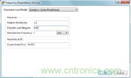 模型生成好后,電容出線的兩端會(huì)自動(dòng)生成Wave Port,所以不需要你手動(dòng)去設(shè)置Port,這里還有一點(diǎn)就是材料的參數(shù)以及孔徑需要你去設(shè)置,材料參數(shù)設(shè)置因?yàn)槭乔胺抡妫杂肈jordjevic-Sarkar Model Input簡(jiǎn)單的頻變模型(圖7),只需要設(shè)置一個(gè)頻點(diǎn)的Dk和Df值就可以求解寬帶的頻變曲線。具體設(shè)置界面如下所示,這里我們板材選用FR-4,Dk和Df的值選擇1GHz頻點(diǎn)。