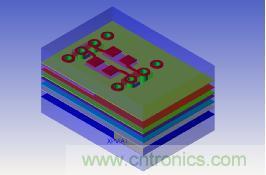 這里我們以0402的AC耦合電容為例進(jìn)行仿真,一端Botm層通過(guò)換層過(guò)孔連接Top面的AC耦合電容,另外一端通過(guò)過(guò)孔再連接到Art12層,這里我們分別仿真3種情況;電容掏空到GND02層,X方向掏34mil,Y方向掏66mil(Case1)。模型建好后的3D效果圖如圖4所示。