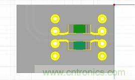 根據(jù)上節(jié)3種Case情況下的仿真結(jié)果和PCB設(shè)計(jì)的實(shí)際情況,AC耦合電容只掏空GND02層,掏空尺寸為X方向掏34mil,Y方向掏66mil。因?yàn)閂iaExpert可以直接導(dǎo)入Brd文件,所以在PCB設(shè)計(jì)完成后在ViaExpert里面直接對(duì)Brd進(jìn)行解析,提取出板上的AC耦合電容和出線。PCB實(shí)際AC耦合電容的設(shè)計(jì)以及導(dǎo)入到ViaExpert中提取完成的3D效果圖分別如圖12和圖13所示。