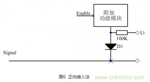 以上運用是建立在二極管單向?qū)щ娦院洼^小節(jié)電容的基礎上。正向接入和反向接入只能是單方向的,不能解決所有情況,也就是說只能針對特殊的功能模塊。如果附加功能模塊需要雙向的,把圖6和圖7結合或許是不錯的選擇。