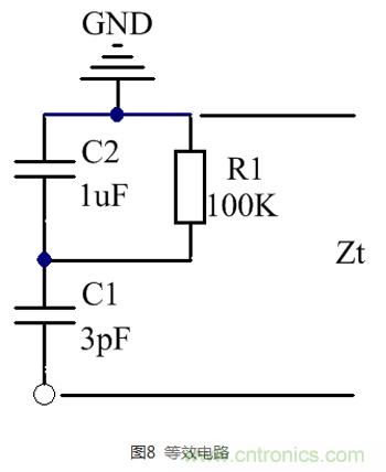 不管正向還是反向接入法,其等效電路都如圖8所示。我們假設二極管的節(jié)電容為3pF,附件功能模塊寄生總電容1uF。如果電阻足夠大,那么可以忽略,此時就是兩個電容串聯(lián),和電阻并聯(lián)類似,CT=C1*C2/(C1+C2)≈C1(C2較大)。大電容就算變化很大,串聯(lián)總電容幾乎等于小電容,即3pF,有效減小接入電容。