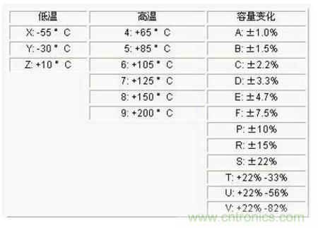 Y5P與Y5V常用于容量為150pF~2nF的電容,溫度范圍比較寬,隨著溫度變化,電容容量變化范圍為±10%或者+22%/-82%。