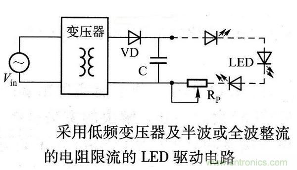 該電路的優(yōu)點(diǎn)是:電路簡(jiǎn)單、成本低。缺點(diǎn)是:體積大、電壓驅(qū)動(dòng)模式,LED亮度會(huì)隨著供應(yīng)電壓的變化而有所改變;無(wú)法提供恒流輸出;突波電流較大。這種LED驅(qū)動(dòng)電源的電路結(jié)構(gòu)非常簡(jiǎn)單,只需要一個(gè)低頻變壓器、整流器、濾波電容,以及一個(gè)用于調(diào)整亮度的可變電阻。串聯(lián)LED的數(shù)目主要由變壓器的匝數(shù)比所決定。一旦選用變壓器的匝數(shù)比固定之后,若要得到一樣的亮度9就很不容易再改變LED的數(shù)目。