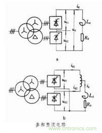 隨著整流電路的功率進(jìn)一步增大(如軋鋼電動(dòng)機(jī),功率達(dá)數(shù)兆瓦),為了減輕對(duì)電網(wǎng)的干擾,特別是減輕整流電路高次諧波對(duì)電網(wǎng)的影響,可采用十二相、十八相、二十四相,乃至三十六相的多相整流電路。圖3a為兩組三相橋串聯(lián)組成的十二相整流電路。為了獲得十二相波形,每個(gè)波頭應(yīng)該錯(cuò)開(kāi)30°。所以采用三繞組變壓器,次級(jí)的兩個(gè)繞組一個(gè)接成星形,另一個(gè)接成三角形,分別供給兩組三相橋。兩組整流橋串聯(lián)后再接到負(fù)載。由于兩組整流橋輸出的電壓的相位彼此差30°,因此在負(fù)載上得到十二脈波的整流電壓,合成電壓中最低次諧波頻率為600Hz,輸出電壓ud=ud1+ud2,電流id=id1=id2。圖3b是兩組三相橋并聯(lián)組成大電流的十二相整流電路。兩橋變壓器次級(jí)繞組電壓依次相差30°。若兩組橋的交流線電壓相等,各自的控制角也相等,則兩組橋的整流平均電壓也相等,只要極性相符合,就可以并聯(lián)運(yùn)行。但是兩組整流電壓的瞬時(shí)值是不等的,兩組電源間會(huì)出現(xiàn)交流環(huán)流。為了限止環(huán)流,延長(zhǎng)晶閘管的導(dǎo)通時(shí)間,需要加入平衡電抗器,輸出電壓ud=(ud1+ud2)/2,電流id=id1+id2。