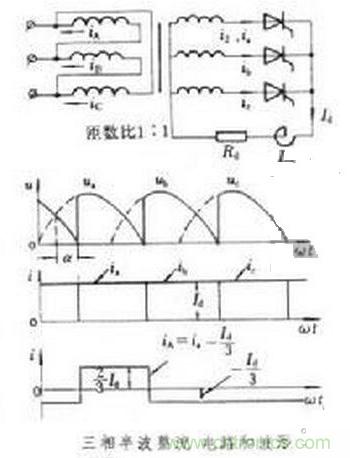 式中S1為初級(jí)容量,S1=m1U1I1;S2為次級(jí)容量,S2=m2U2I2;m1、m2分別為變壓器初、次級(jí)繞組相數(shù)。帶有大電感負(fù)載的三相半波電路如圖4所示。