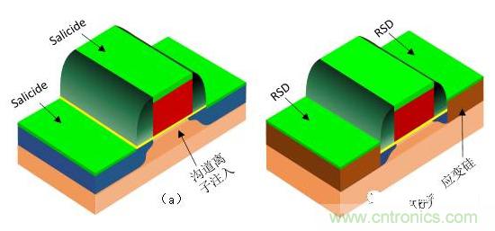 隨著MOS器件的特征尺寸不斷縮小到90nm及以下時,短溝道效應(yīng)中的器件亞閾值電流成為妨礙工藝進(jìn)一步發(fā)展的主要因素,盡管提高溝道摻雜濃度可以在一定程度上抑制短溝道效應(yīng),然而高摻雜的溝道會增大庫倫散射,使載流子遷移率下降,導(dǎo)致器件的速度降低,所以僅僅依靠縮小MOS器件的幾何尺寸已經(jīng)不能滿足器件性能的提高,需要一些額外的工藝技術(shù)來提高器件的電學(xué)性能,例如應(yīng)變硅技術(shù)。應(yīng)變硅技術(shù)是通過外延生長在源漏區(qū)嵌入應(yīng)變材料使溝道發(fā)生應(yīng)變,從而提高載流子遷移率,最終提高器件的速度。例如NMOS的應(yīng)變材料是SiC,PMOS的應(yīng)變材料是SiGe。另外,隨著源漏的結(jié)深的短減小,源漏擴(kuò)散區(qū)的厚度已經(jīng)不能滿足形成Salicide的最小厚度要求,必須利用新技術(shù)RSD(Raise Source and Drain)技術(shù)來增加源漏擴(kuò)散區(qū)的厚度。RSD技術(shù)是通過外延技術(shù)生長在源漏區(qū)嵌入應(yīng)變材料的同時提高源漏擴(kuò)散區(qū)的厚度。如圖1.15(b)所示,是采用應(yīng)變硅和RSD技術(shù)的MOS管結(jié)構(gòu)圖。