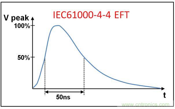 開關(guān)電路關(guān)聯(lián)的瞬變干擾,這類電路能夠以容性方式耦合至通信端口。EFT的纏上包括繼電器和開關(guān)觸點(diǎn)抖動(dòng),或者因?yàn)楦行曰蛉菪载?fù)載切換而產(chǎn)生的瞬變, 而所有這些在工業(yè)環(huán)境中都很常見。EC 61000-4-4中定義的 EFT測試,就是去模擬這些事件產(chǎn)生的干擾。