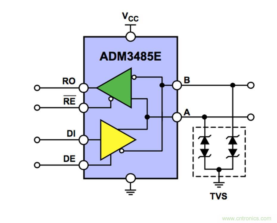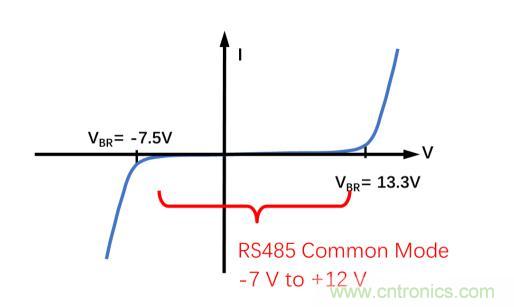 重要的是要確保TVS的擊穿電壓在受保護(hù)引腳的正常工作范圍之外。CDSOT23-SM712的獨(dú)有特性是具有+13.3 V和–7.5 V的非對稱擊穿電壓,與RS-485芯片ADM3485E的+12 V至–7 V的收發(fā)器共模范圍相匹配,從而提供最佳保護(hù),同時(shí)最大限度地減小對RS-485收發(fā)器的過壓應(yīng)力。