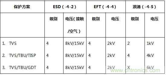按照以上的規(guī)范要求和設(shè)計(jì)原則,下面我們提供三種不同級(jí)別的EMC防護(hù)解決方案,這些方案都已經(jīng)經(jīng)過了第三方獨(dú)立EMC兼容性測試的認(rèn)證。方案中用到的元器件包括: