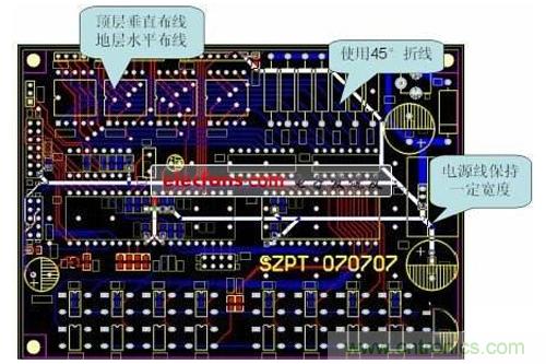 (2)合理安排接口元器件的位置和方向。一般來(lái)說(shuō),作為電路板和外界(電源、信號(hào)線)接的連接器元器件,通常置在電路板的邊緣,如串口和并口。放在電路板的中央,不利于接線,也可能因?yàn)槠渌骷淖璧K而無(wú)法連接。另外還要注意接口的方向,使連接線可以順利地引出,遠(yuǎn)離電路板。接口放置后,應(yīng)當(dāng)利用接口元器件的String(字符串)清晰地標(biāo)明接口的種類;對(duì)于電源類接口,應(yīng)當(dāng)標(biāo)明電壓等級(jí),防止因接線錯(cuò)誤導(dǎo)致電路板燒毀。