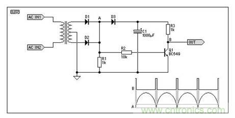 過零點(diǎn)檢測(cè)可采用硬件實(shí)現(xiàn),在硬件設(shè)計(jì)中,可以增加如圖4 或圖5過零點(diǎn)的硬件檢測(cè)電路,通過在B端輸出為高電平時(shí)進(jìn)行按鍵狀態(tài)的判斷,以期在電磁輻射最小的時(shí)候?qū)τ|摸按鍵進(jìn)行檢測(cè)。