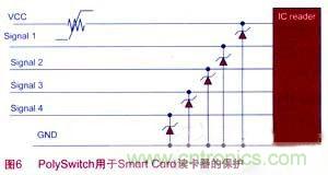 接觸式Smart Card內(nèi)部有一個(gè)IC芯片,用于傳輸信息、存儲(chǔ)數(shù)據(jù)等。Smart Card工作時(shí),由讀卡器的Vcc電壓供電。損壞的Smart Card或者其他導(dǎo)電物品被錯(cuò)誤地放進(jìn)讀卡器,都有可能造成讀卡器電路出現(xiàn)短路,而造成永久損壞。在讀卡器電路中使用PolySwitch可恢復(fù)器件能夠?qū)Υ祟愲娐饭收线M(jìn)行保護(hù)。如圖6,在讀卡器的Vcc供電電路中串聯(lián)PolySwitch器件,當(dāng)出現(xiàn)短路過電流故障時(shí),PolySwitch器件能夠切斷電路,在故障排除后恢復(fù)電路,并在所有端口進(jìn)行ESD防護(hù)。
