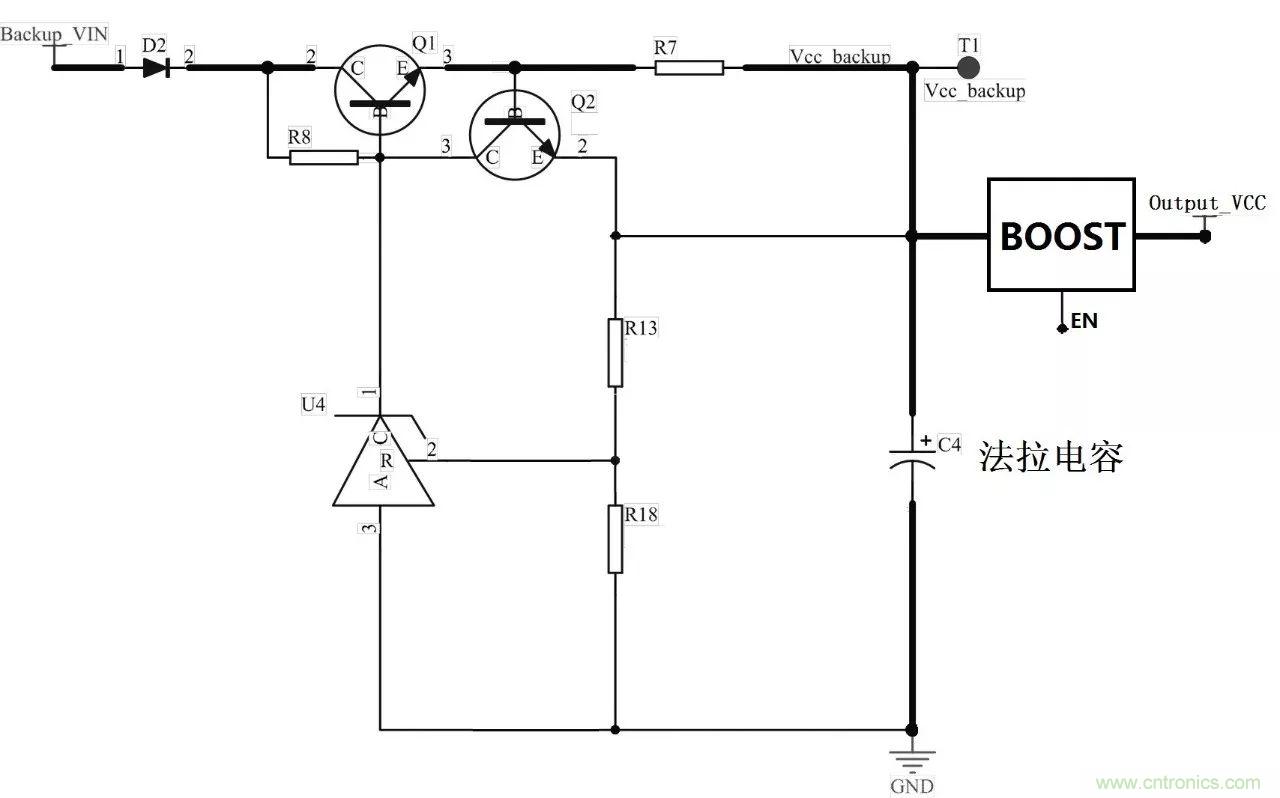 若對(duì)電壓高于法拉電容本身電壓上限的電源系統(tǒng)提供掉電續(xù)航時(shí),Vcc_backup端需通過BOOST升壓電路后以實(shí)現(xiàn),且注意系統(tǒng)正常時(shí)(充電過程中)關(guān)斷EN腳。