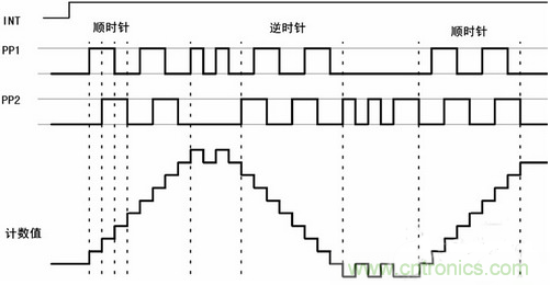 方向盤轉(zhuǎn)角傳感器的輸出為正交編碼脈沖。正交編碼脈沖包含兩個(gè)脈沖序列,有變化的頻率和四分之一周期(90°)的固定相位偏移,如圖1所示。通過檢測2路信號的相位關(guān)系可以判斷為順時(shí)針方向和逆時(shí)針方向,并據(jù)此對信號進(jìn)行加/減計(jì)數(shù),從而得到當(dāng)前的計(jì)數(shù)累計(jì)值,也即方向盤的絕對轉(zhuǎn)角,而轉(zhuǎn)角的變化率即角速度,則可通過信號頻率測出。另外,方向盤轉(zhuǎn)角傳感器有一個(gè)零位輸出信號,當(dāng)方向盤在中間位置時(shí),該信號輸出0V,否則輸出5V,通過該信號,可對絕對轉(zhuǎn)角進(jìn)行在線校準(zhǔn)。