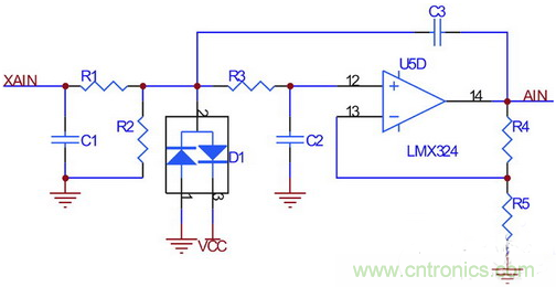 根據(jù)前面部分介紹的輪速傳感器信號特點(diǎn),設(shè)計(jì)接口電路如圖3所示。