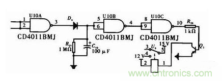 此部分電路的設計采用雙輸入四與非門CD4011做反相器、開關二極管D6、電阻R27、電解電容C10、三極管2N3904和繼電器。R26的選取由繼電器的驅動電流和2N3904的放大倍數(shù)β來決定,過小則增加功耗,過大則不能驅動繼電器。R27和C10的放電時間就是系統(tǒng)過流欠壓保護后檢測的間隔時間。時間T=2×R27×C10。