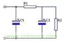 使用兩個電容和一個電阻組成RC濾波電路,又稱π型RC濾波電路。見圖20所示。這種濾波電路由于增加了一個電阻R1,使交流紋波都分擔在R1上。R1和C2越大濾波效果越好,但R1過大又會造成壓降過大,減小了輸出電壓。一般R1應(yīng)遠小于R2。