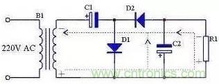 前面介紹的三種整流電路輸出電壓都小于輸入交流電壓的有效值,如果需要輸出電壓大于輸入交流電壓有效值時可以采用倍壓電路,見圖12。由圖13可知,在電源的正半周,變壓器B1次級上端為正下端為負,D1導(dǎo)通,D2截止,C1通過D1充電,充電后C1兩端電壓接近B1次級電壓峰值,方向為左端正右端負;由圖14可知,在電源的負半周,變壓器B1次級上端為負下端為正,D1截止,D2導(dǎo)通,C2通過D1充電,充電后C2兩端電壓接近C1兩端電壓與B1次級電壓峰值之和,方向為下端正上端負。由于負載R1與C1并聯(lián),當R1足夠大時,R1兩端的電壓即為接近2倍B1次級電壓。