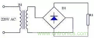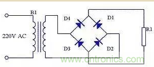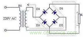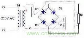 由于全波整流電路需要特制的變壓器,制作起來比較麻煩,于是出現(xiàn)了一種橋式整流電路。這種整流電路使用普通的變壓器,但是比全波整流多用了兩個整流二極管。由于四個整流二極管連接成電橋形式,所以稱這種整流電路為橋式整流電路。
