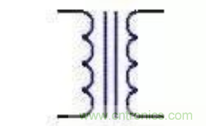 通常直流穩(wěn)壓電源使用電源變壓器來改變輸入到后級電路的電壓。電源變壓器由初級繞組、次級繞組和鐵芯組成。初級繞組用來輸入電源交流電壓,次級繞組輸出所需要的交流電壓。通俗的說,電源變壓器是一種電→磁→電轉(zhuǎn)換器件。即初級的交流電轉(zhuǎn)化成鐵芯的閉合交變磁場,磁場的磁力線切割次級線圈產(chǎn)生交變電動勢。次級接上負載時,電路閉合,次級電路有交變電流通過。變壓器的電路圖符號見圖1。