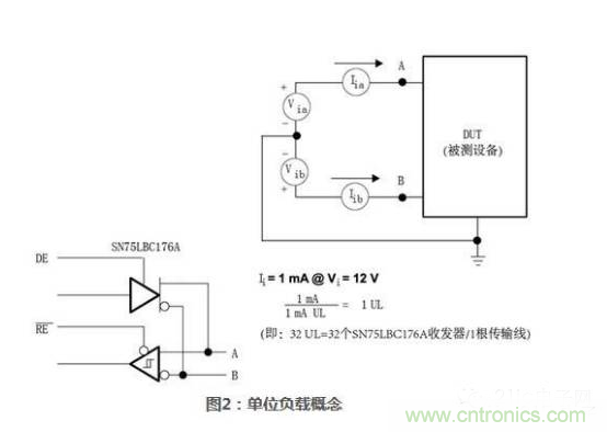 圖2給出了SN75LBC176A收發(fā)器單位負載計算的例子。因為這款設備將驅(qū)動器和接收器集成到一起構(gòu)成了收發(fā)器(即驅(qū)動器輸出和接收器輸入連接到了同一根總線上),因此很難分別獲取驅(qū)動器泄漏電流和接收器輸入電流。為了便于計算,將接收器輸入阻抗看作12 k?并給收發(fā)器1mA電流。這可以代表一個單位負載,一跟傳輸總線上允許32個這樣的負載。