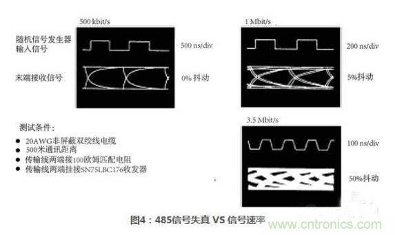確定隨機噪聲、抖動、失真等對信號影響程度的最簡單方法是使用眼圖。圖4顯示使用20AWG雙絞線電纜500米處、不同信號速率下,接收端的信號失真情況。當信號速率進一步增加,抖動的影響變得更加顯著。在1Mbit/s時,抖動大約為5%,而在3.5Mbit/s時,信號開始徹底被淹沒,傳輸質(zhì)量嚴重降級。在實際系統(tǒng)中,可允許的最大抖動一般要小于5%。