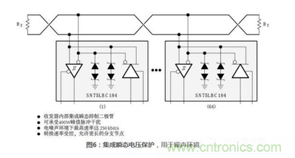 圖6所示內(nèi)部集成瞬態(tài)抑制二極管的485收發(fā)器SN75LBC184,用于既希望使用完整485功能,PCB空間又受限的場合。SN75LBC184在內(nèi)部集成了保護二極管,針對高能量電氣噪聲環(huán)境,可直接替換SN75LBC176。